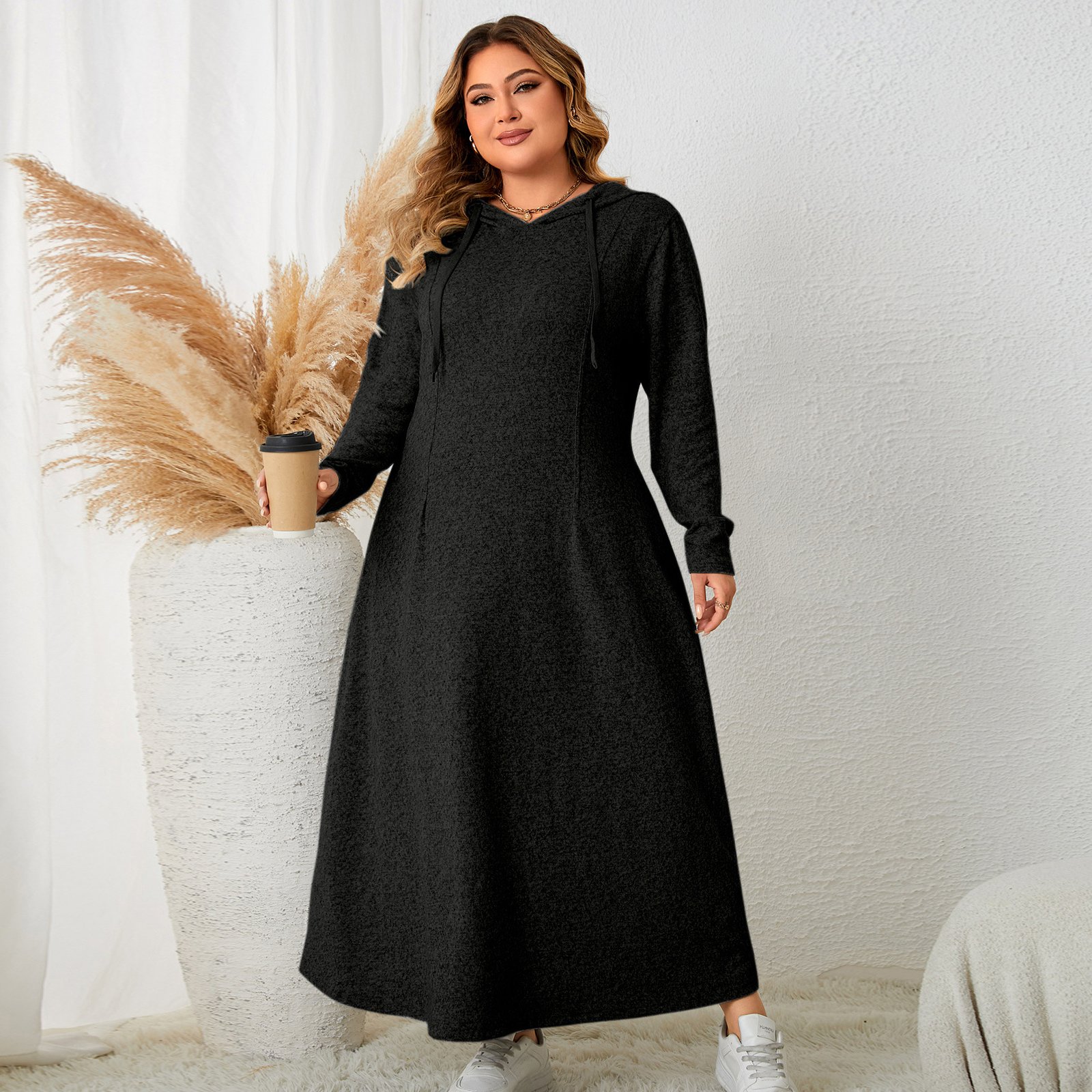 This fashionable casual dress features a stylish hood and a flattering A-line silhouette. Made from lightweight polyester fabric, it offers comfort and ease for everyday wear.