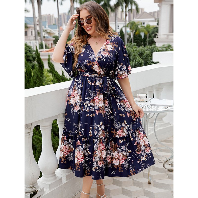 This elegant A-line dress features a stunning floral print on a deep navy blue background, perfect for any casual outing or business meeting. The dress is made of high-quality polyester, ensuring comfort and durability.