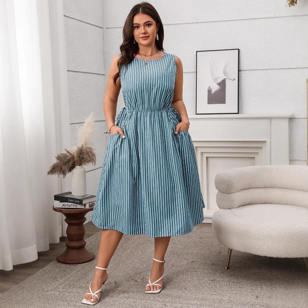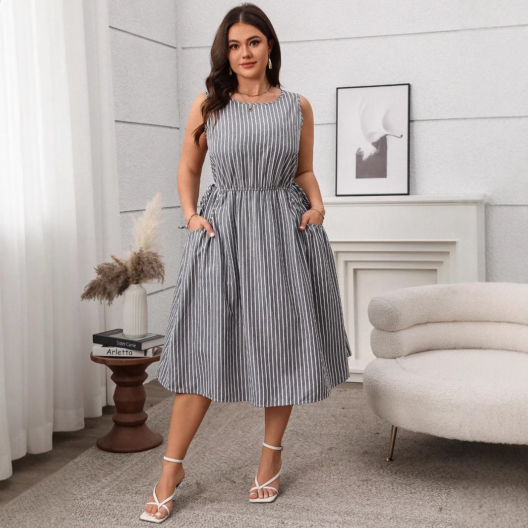 Made from high-quality polyester, this fashionable midi dress features a chic striped design and practical pockets, making it perfect for everyday wear. The A-line silhouette flatters different body types, while the sleeveless style keeps you comfortable during warm days.