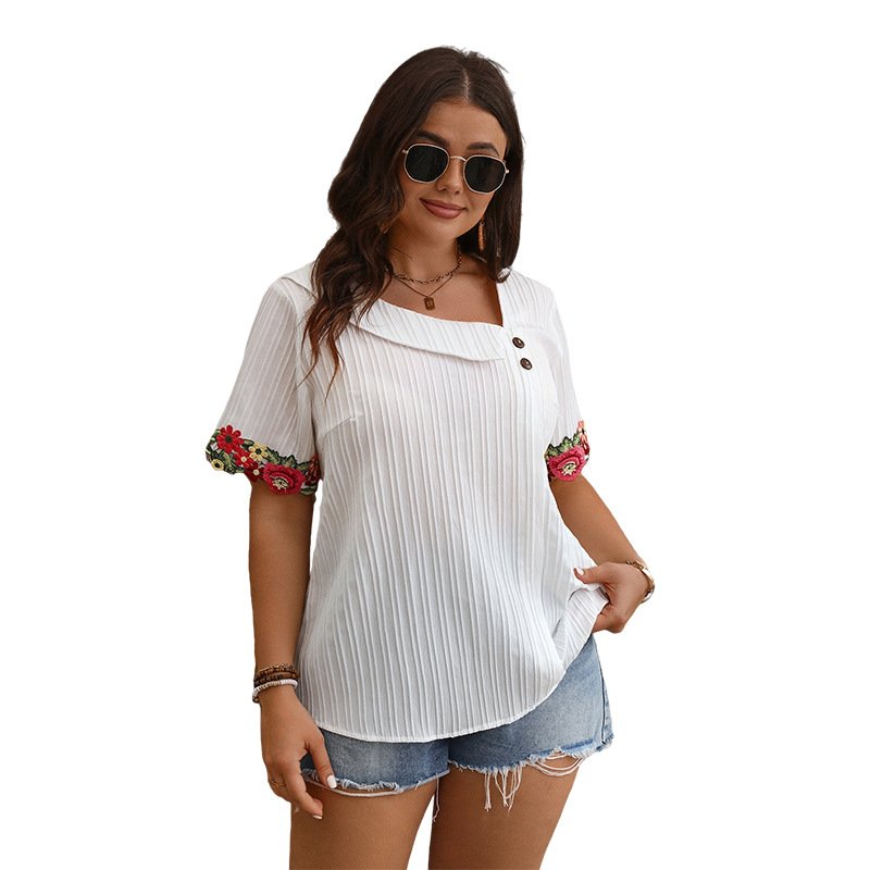 Introducing our elegant loose-fit short sleeve top, perfect for casual or office wear. This stylish top features a contemporary V-neck design and delicate embroidery. Made from high-quality woven polyester fabric, it ensures comfort and breathability for all-day wear.